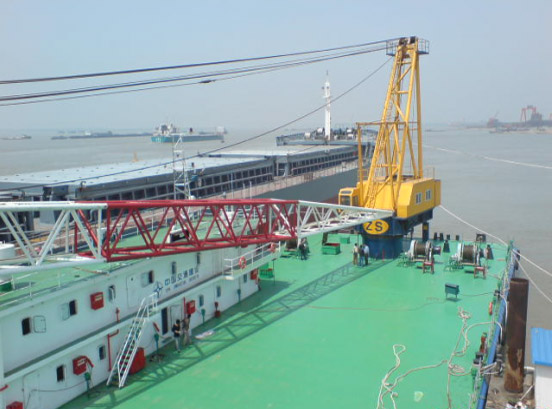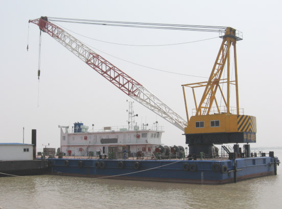 由中交二公局集團(tuán)承建,采用中昇建機(jī)ZSF2700(271000)船式起重機(jī)(柴油驅(qū)動(dòng)中國(guó)船級(jí)社CCS認(rèn)證),最大吊重27m處吊100t,已于2008年二月于江蘇省江都港口舉行下水儀式且已正式啟用,此一船吊為我公司又一成功之大起重量起重設(shè)備。