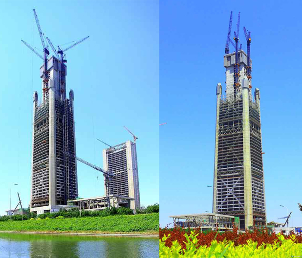 由中建三局承建的天津高銀117大廈工程采用了中昇建機ZSL2700(2臺)、ZSL1250(2臺)共4臺塔機,吊裝順利進行!ZSL2700在世界高層鋼結構建設中,屬超大型的內爬式動臂塔式起重機。ZSL2700采用柴油發動機引擎驅動,該塔機最大工作幅度為65m,而在27m吊裝幅度范圍內可吊重達100t,最大起升高度達597m,起升速度達110m/min。其吊裝性能和技術水平在國內處于領先地位!