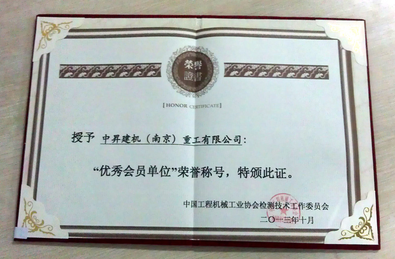 中昇建機(jī)被中國工程機(jī)械工業(yè)協(xié)會檢測技術(shù)工作委員會授予2013年度“優(yōu)秀會員單位”榮譽稱號