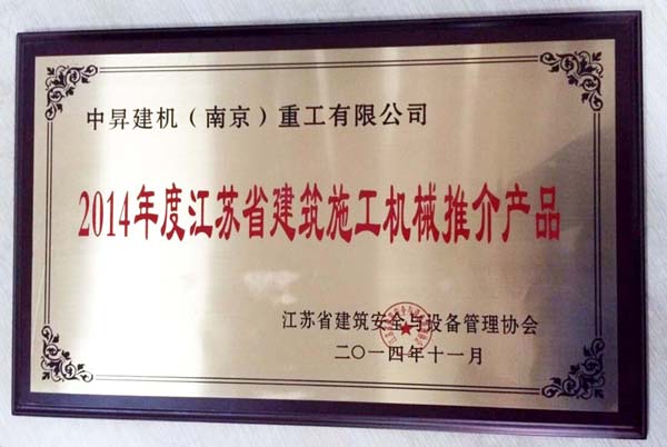 2014年11月,中昇建機(jī)(南京)重工有限公司以一如既往的優(yōu)異表現(xiàn)被江蘇省建筑安全與設(shè)備管理協(xié)會(huì)評(píng)為“江蘇省建筑施工機(jī)械推介產(chǎn)品”榮譽(yù)稱號(hào),并頒發(fā)獎(jiǎng)?wù)隆?