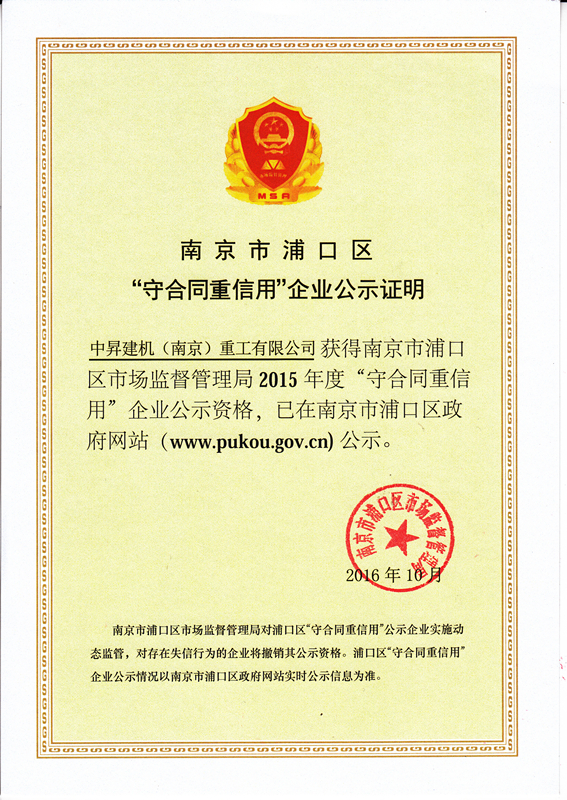 2016年10月,我公司獲得南京市浦口區市場監督管理局2015年度“守合同重信用”企業公示資格,已在南京市浦口區政府網站(www.pukou.gov.cn)公示。