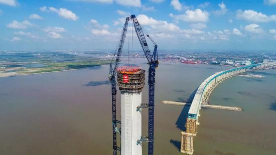 9月28日上午11:28,隨著最后一方混凝土澆筑完畢,由中鐵大橋局負責施工、中昇建機提供大型塔吊的世界最高公鐵橋主塔——滬通長江大橋北側28號主塔成功封頂,標志著滬通長江大橋工程取得關鍵進展。