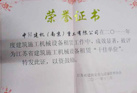 中昇建機被評為2011年度江蘇省建筑施工機械設備租賃“十佳單位”