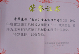 中昇建機被評為2011~2012年度江蘇省建筑施工機械設備租賃“十佳單位”
