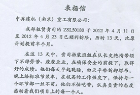 我公司在中建八局金陵飯店擴建工程項目結束之際,以認真負責的態度、高水平的施工質量,圓滿完成塔機拆除工作,榮獲項目方的高度表揚。 2012-06-26 |