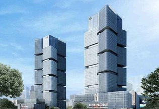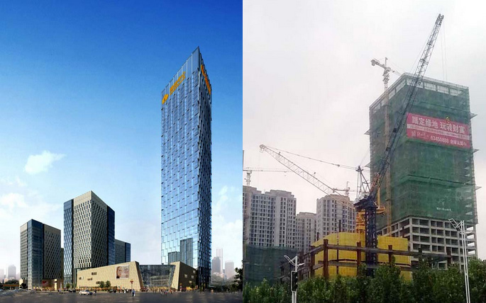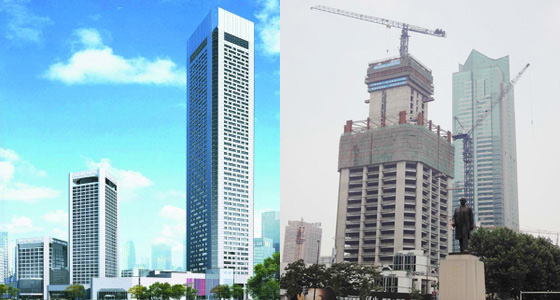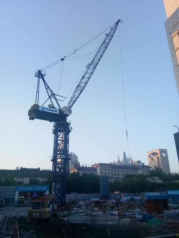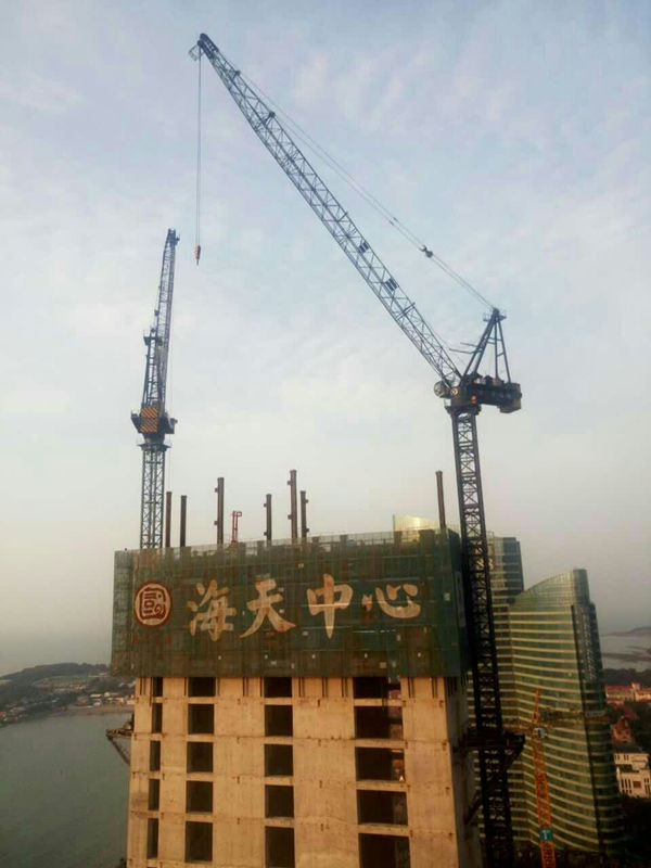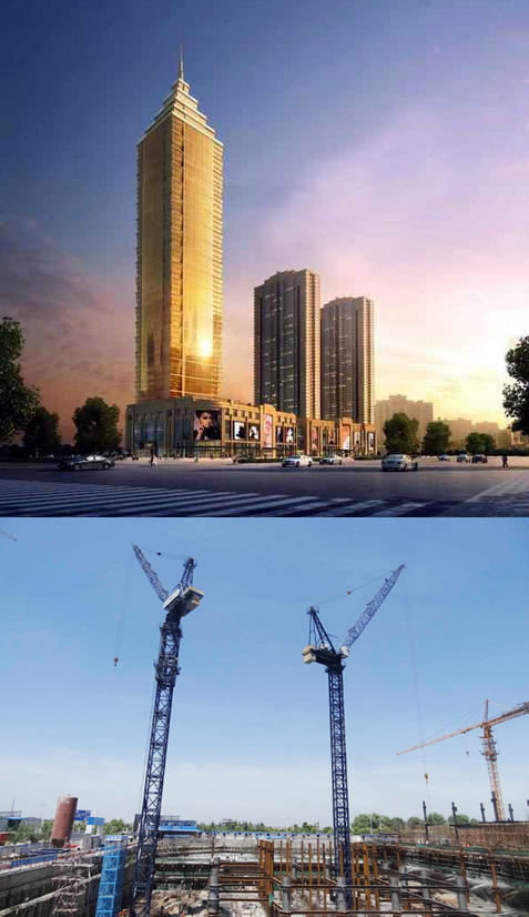 大樓高度208米,采用中昇建機ZSL1000一臺(最大吊重64t)和ZSL750一臺(最大吊重50t)。